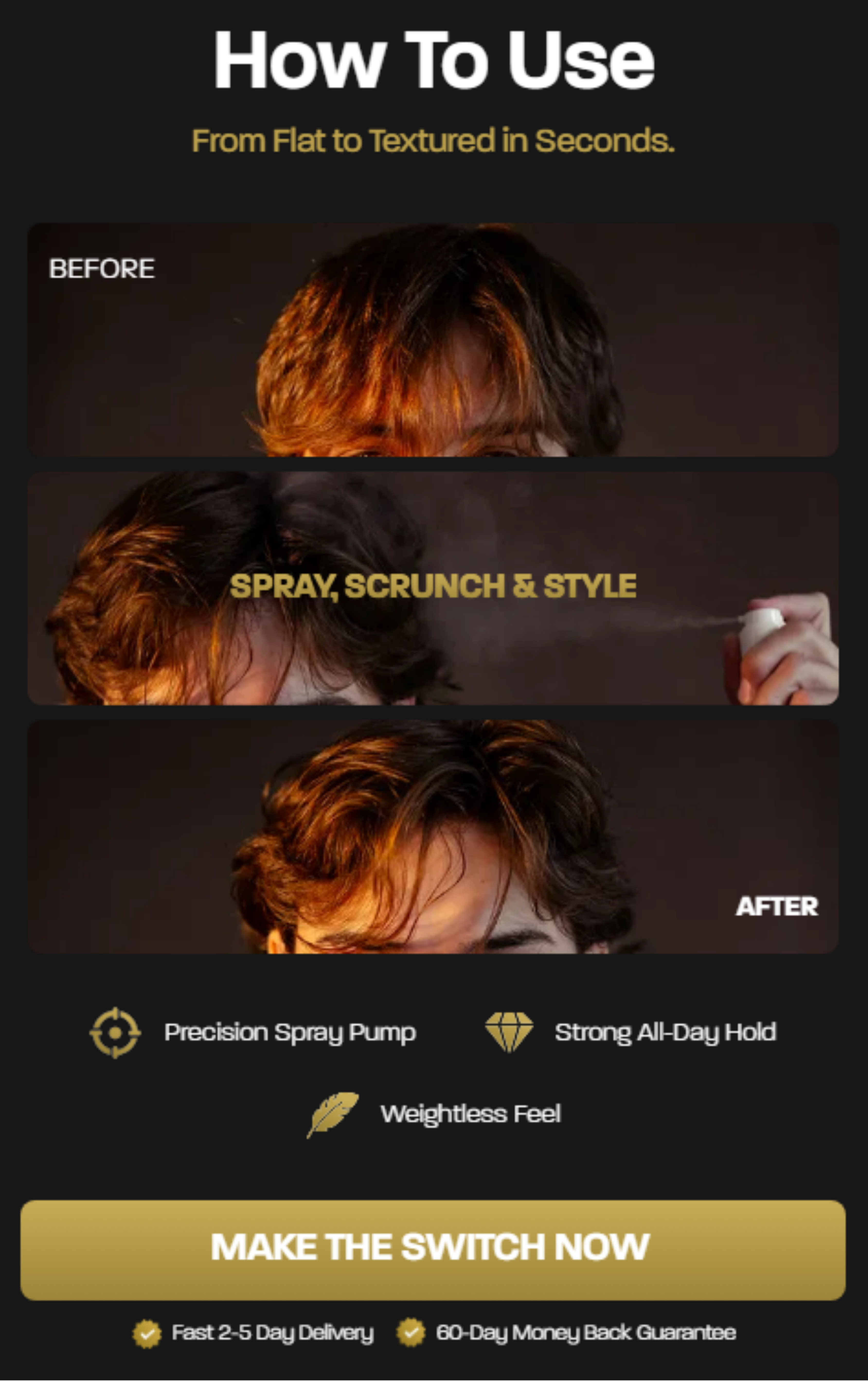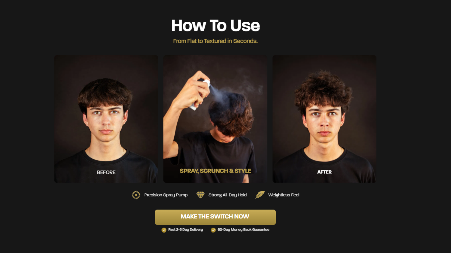 Simple. Spray it 2-4 times, scrunch it into your roots to activate, then style it exactly how you want. Amount of sprays will vary on your hair length and thickness.